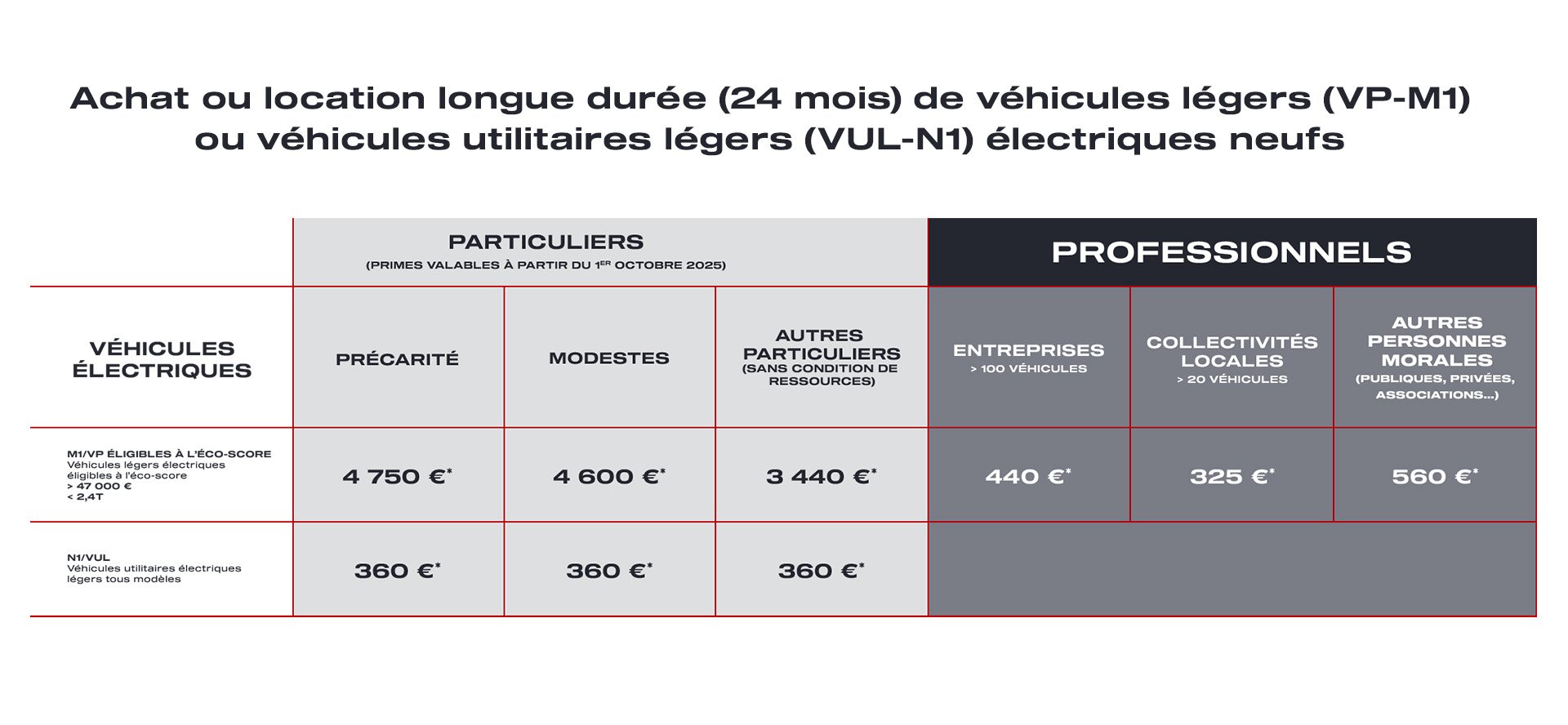 A partir du 1er octobre 2025, le Bonus écologique électrique pour les particuliers est également remplacé par les primes CertiNergy avec des montants allant de 360 € à 4 750 € selon les revenus du foyer (cliquez ici pour accéder au tableau des plafonds de revenus).