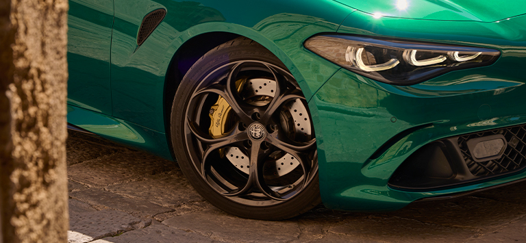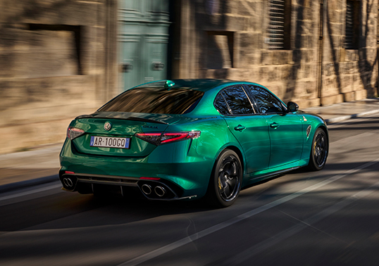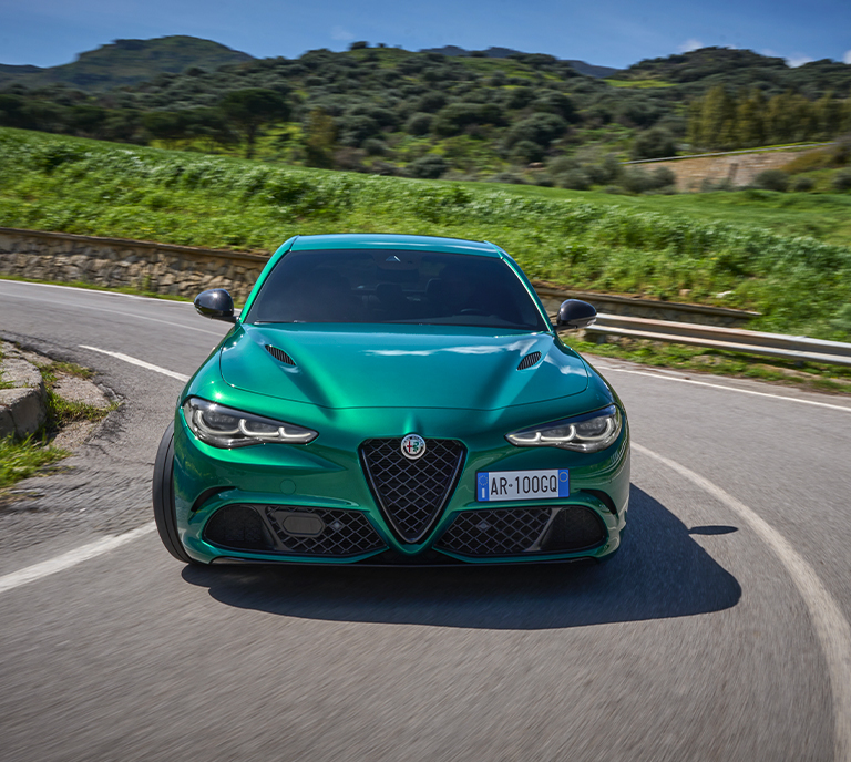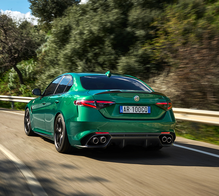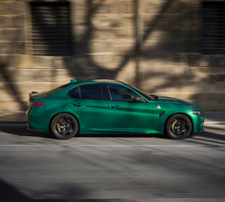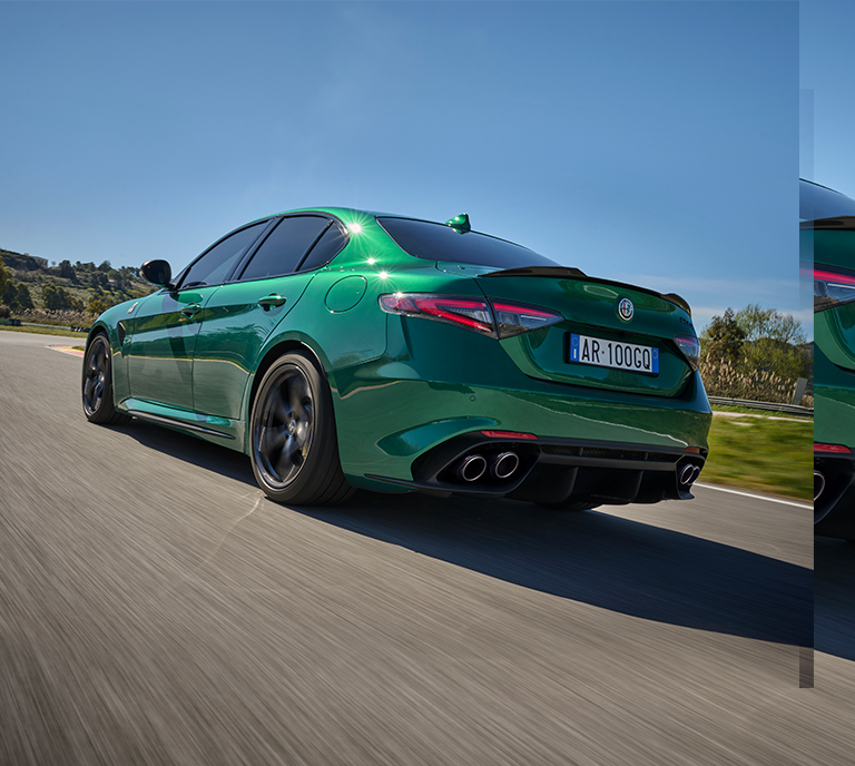 Consommation de carburant Gamme Giulia Quadrifoglio (l/100 km): 10,1; Émission de CO₂ (g/km) : 229 - 228. Valeurs déterminées sur la base du cycle pondéré WLTP, mis à jour à partir du 4 avril 2023 lors des activités de test de pré-approbation et pouvant varier avant l'homologation finale. Les valeurs indiquées sont à titre comparatif et peuvent varier avant l'homologation finale Les valeurs indiquées sont à titre comparatif.