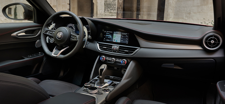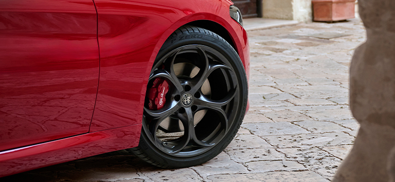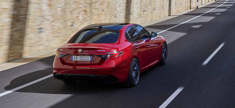 Consommation de carburant Alfa Romeo Giulia Tributo Italiano (l/100 km) : 8,4 – 4,8 ; émissions de CO₂ (g/km) : 188 - 130. Valeurs déterminées sur la base du cycle pondéré WLTP, mises à jour à partir du 26 septembre 2022 lors des activités de test de pré-homologation et pouvant varier avant l'homologation finale. Les valeurs indiquées le sont à des fins de comparaison.